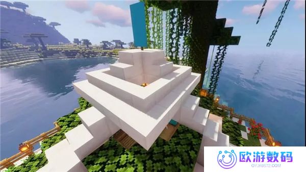 12、方便停船和钓鱼的码头:用去皮橡木原木往外延伸一个3x5的平台,平台下方用橡木栅栏向下延伸出简单的支柱,